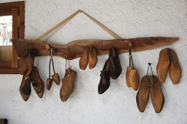 shoe lasts hanging on the wall in the workshop